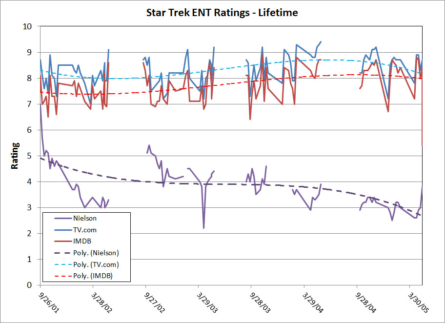 User ratings for Star Trek: Enterprise on TV.com and IMDB along with Nielson ratings.