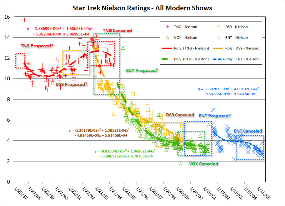 For this particular picture, I'm looking at the lifetime Nielson ratings for the 80' - 00's era of Star Trek (TNG, DS9, VOY, ENT), fitting simple curve fits to the data to look at how its trending, and then trying to highlight some of the data that may have led to shows getting pitched or canned.
