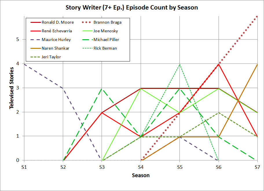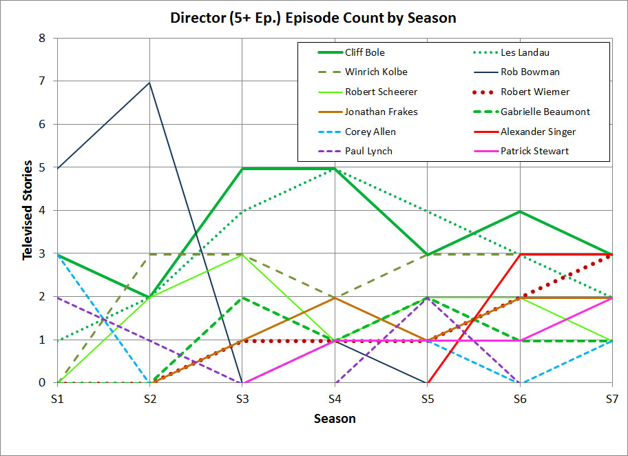 Other data looks at: the Nielson's for shows in isolation, Nielson for TNG seasons, ratings by characters (main, support, guest), by settings and plot threads, by directors, and by writers, as well as some other visualizations to show relative ratings of groups.