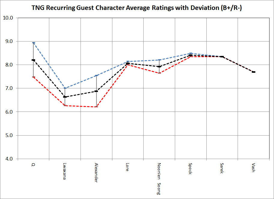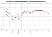 Plot of the various characters common to TNG and how they rate on average with viewers for their episodes.