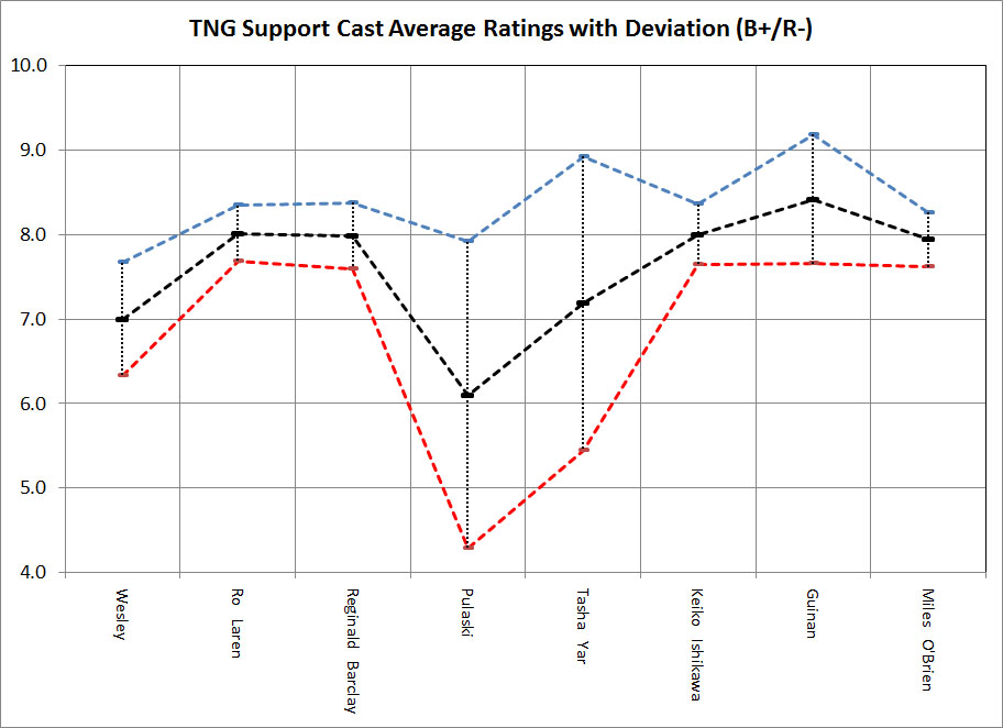 🚀 The Next Generation, Supporting Cast, References / Season and Average Appearance User Rating with Deviations