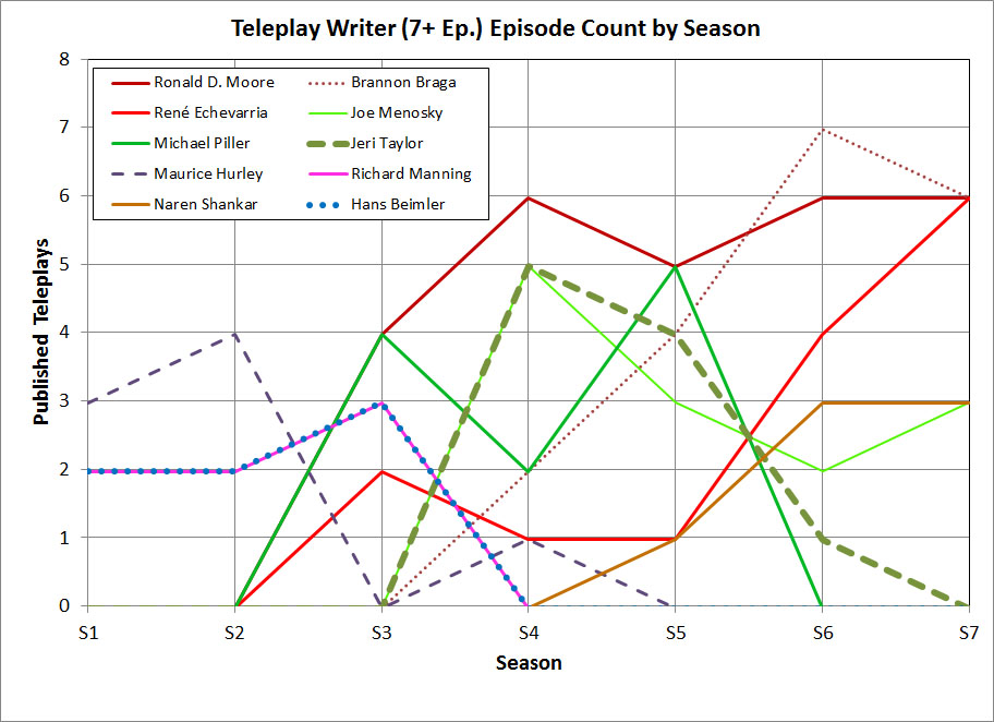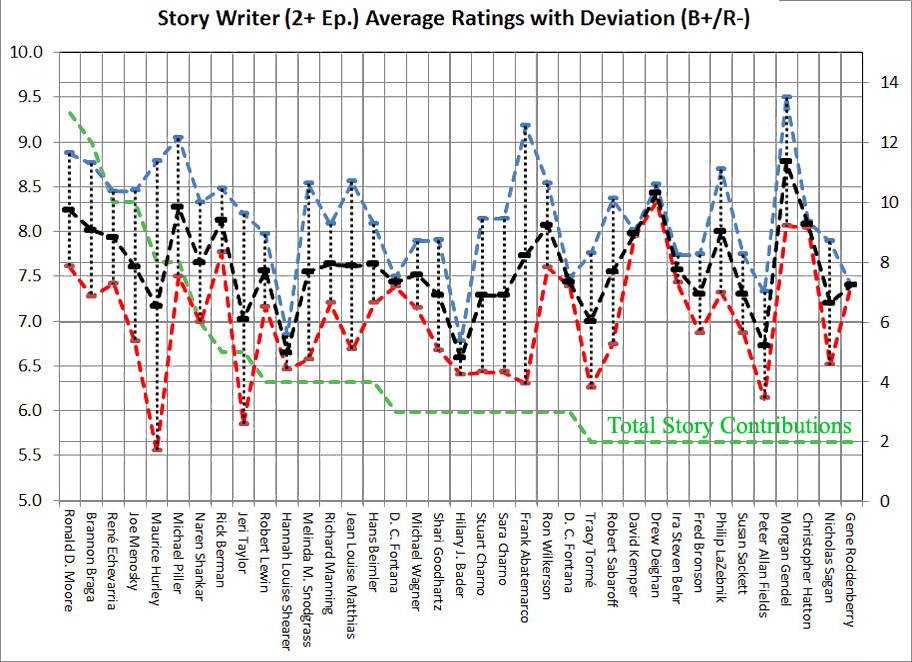 🚀 The Next Generation, Writers for Teleplays, References / Season and Average Appearance User Rating with Deviations