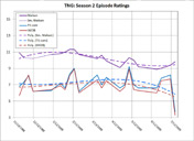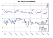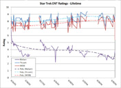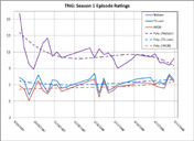 User ratings for Star Trek: The Next Generation on TV.com and IMDB along with Nielson ratings.