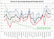 These plots graph the director participation (2+ episodes minimum) and average rating per show they worked on. Episode summaries on Wikipedia, IMDB, and TV.com were searched for a given keyword, in this case, the names of the director. The first chart is the number of episodes which directly reference a director in the synopsis on wikipedia or TV.com and then showed how they trend over the seasons of the show. For the second chart, all episodes associated with those words had their ratings averaged, and then that rating is plotted here with the standard deviation up / down.