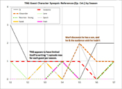 These plots graph the guest cast appearances and average rating per cast member. Episode summaries on Wikipedia, IMDB, and TV.com were searched for a given keyword, in this case, the names of the guest cast. The first chart is the number of episodes which directly reference a guest cast character in the synopsis on wikipedia or TV.com and then showed how they trend over the seasons of the show. For the second chart, all episodes associated with those words had their ratings averaged, and then that rating is plotted here with the standard deviation up / down.