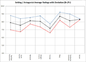 These plots graph the settings or antagonist appearances and average rating per cast member. Episode summaries on Wikipedia, IMDB, and TV.com were searched for a given keyword, in this case, the names of the settings or antagonist. The first chart is the number of episodes which directly reference a settings or antagonist in the synopsis on wikipedia or TV.com and then showed how they trend over the seasons of the show. For the second chart, all episodes associated with those words had their ratings averaged, and then that rating is plotted here with the standard deviation up / down.