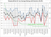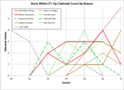 These plots graph the writers for story participation (2+ episodes minimum) and average rating per show they worked on. Episode summaries on Wikipedia, IMDB, and TV.com were searched for a given keyword, in this case, the names of the writer. The first chart is the number of episodes which directly reference a writer in the synopsis on wikipedia or TV.com and then showed how they trend over the seasons of the show. For the second chart, all episodes associated with those words had their ratings averaged, and then that rating is plotted here with the standard deviation up / down.