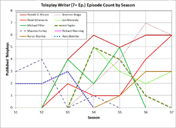 These plots graph the writers for teleplay participation (2+ episodes minimum) and average rating per show they worked on. Episode summaries on Wikipedia, IMDB, and TV.com were searched for a given keyword, in this case, the names of the writer. The first chart is the number of episodes which directly reference a writer in the synopsis on wikipedia or TV.com and then showed how they trend over the seasons of the show. For the second chart, all episodes associated with those words had their ratings averaged, and then that rating is plotted here with the standard deviation up / down.